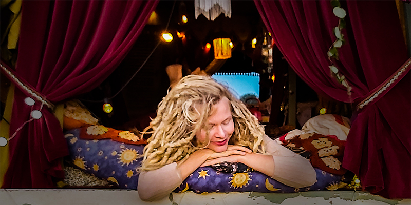 So reist die Künstlerin mit ihrem Schneckenhaus auf vier Rädern und Fahrtwind aus allen Himmelsrichtungen durch die Lande, stets begleitet von Hündchen My. Den blonden wilden Kopf voller Träume und nichts im Gepäck als ihre treue Geige, geheimnisvolle Geschichten und Melodien … und die Sterne.